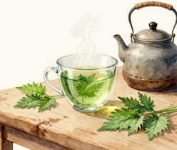 A hand gently pours hot water from a teapot into a teacup containing a herbal tea bag, with soft steam rising, on a simple kitchen counter in a cozy watercolor style.